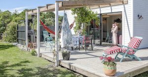 Rebecka och Mats byggde sin kolonistuga med inspiration från amerikanska surforter och tillförde skandinaviska inslag. Resultatet blev en oas där inne och ute möts kring turkosa detaljer.