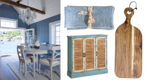 En lugn blå färg på väggarna tillsammans med vita eleganta möbler ger en fin kontrast till de mörka bjälkarna i taket. Inslaget av mörkt trä gör att den rustika känslan lever kvar.