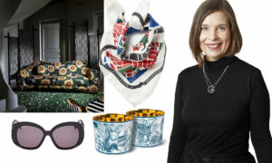 En blommig jubileumsklänning, champagnemuggar i guld och tyg med solrosor Karin Ohlsson-Leijon listar sina favoriter just nu!