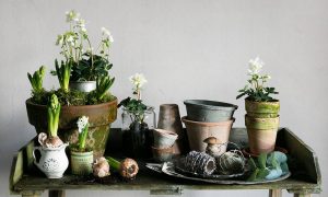 Låt julen gå i vitt och grönt och gör vackra arrangemang av hyacinter och skira julrosor. Det gamla mormorsporslinet och hempatinerade lerkrukor blir finaste planteringskärlen. [i]Foto: Sofi Sykfont[/i]